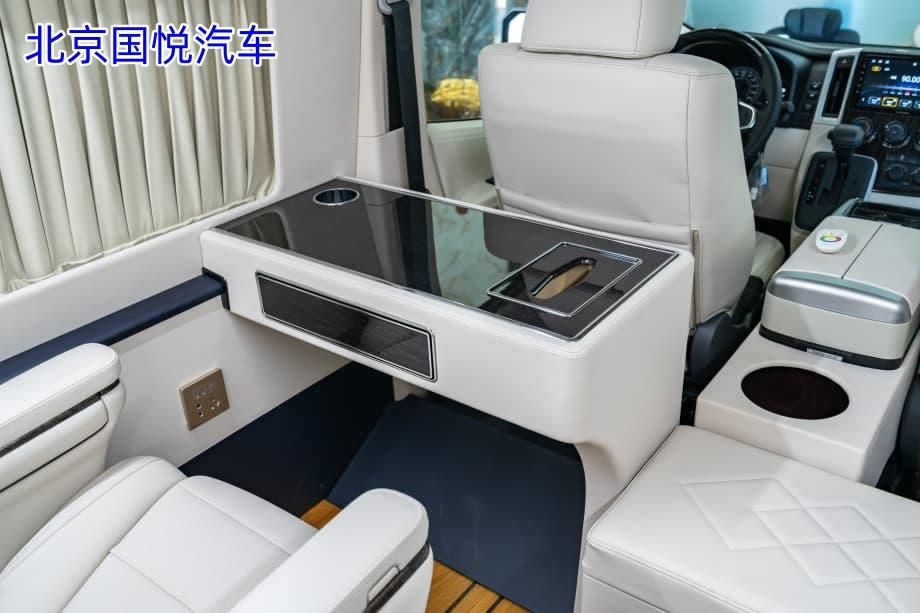 作业桌边际带圆弧收边,防止磕碰危险,旁边面集成无线充电模块,支撑手机快充,商务途中可随时举行小型会议,9 人团队同步处理作业,功率倍增。不用时作业桌折叠收纳,与车身旁边面平齐,不占用过道空间,保证进出顺利。
